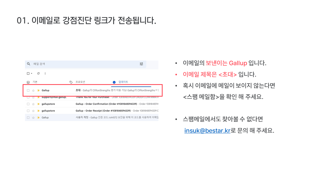 갤럽 강점 진단지를 대신 구매해 드리고 이메일로 발송해 드리는 서비스 입니다.